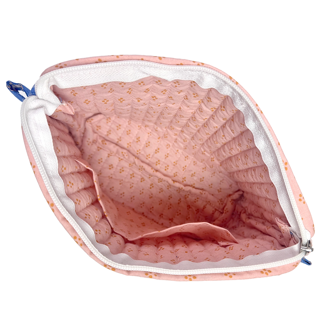 Grab your bag and head out on your next adventure! Our quilted cotton zipper pouches are the perfect companion. With details like a flirty tassel and custom dyed piping, these little darlings are a statement item for your journey. Color: Bright blue with light pink aspects Material: 100% premium cotton Sizing: 9.5 x 6.5 x 3 inches Designed in the U.S. Produced sustainably in India