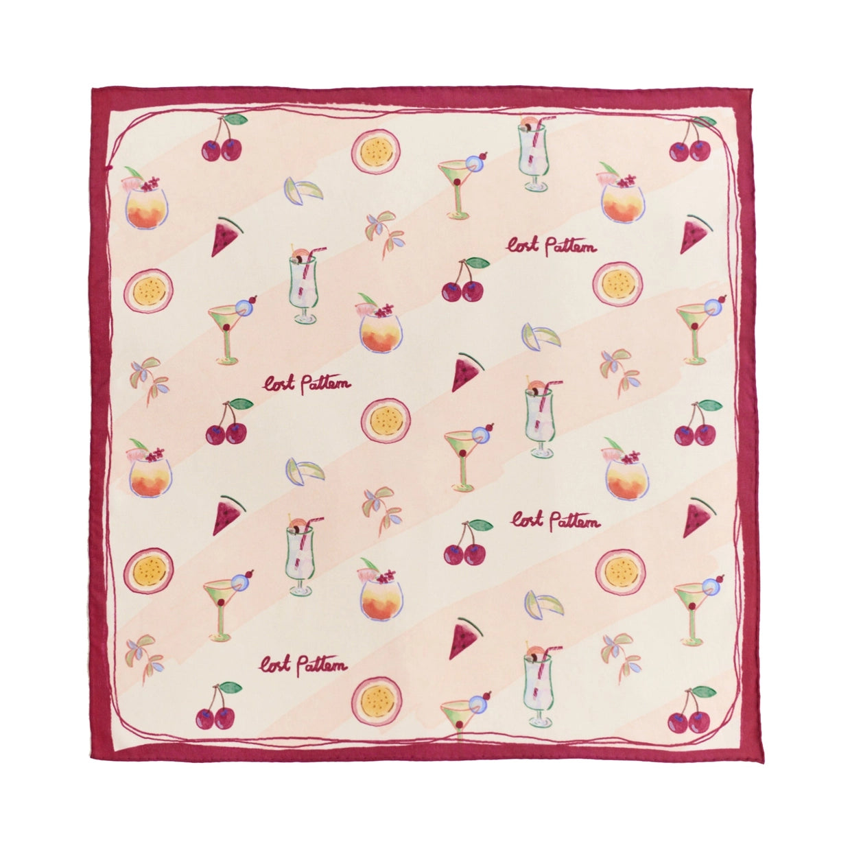 Introducing the Lost Pattern "Happy Hour" silk scarf, a delightful bandana scarf that embodies the essence of joyful moments. Inspired by the celebratory spirit of happy hour, this vibrant silk bandana showcases designs of our favorite drinks. Versatile and stylish, it can be worn as a chic neck scarf, trendy head wrap, an elegant bag accessory and more. Infuse any outfit with a splash of cheer and a festive vibe with the "Happy Hour" scarf, perfect for brightening every day and every moment. Product Description: * 100% silk crepe - a premium and lightweight type of mulberry silk * 50cm x 50cm ( 20"W x 20"L ) * Hand-rolled edges with hand stitching finishing * Each silk scarf comes packed in our luxury box, making it the perfect gift for someone special *Due to the handmade nature of the edges, the measurement may vary slightly.