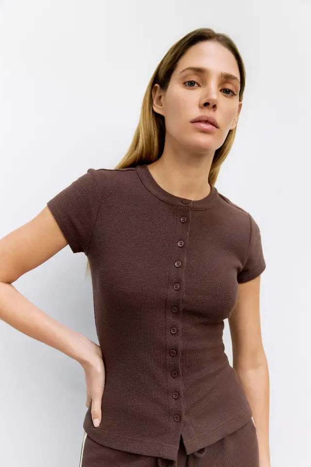 The Enzo Top is cut from midweight stretch waffle-knit for a flattering, form-fitting fit. The crewneck, short sleeves, and full front buttons add subtle structure and modern texture