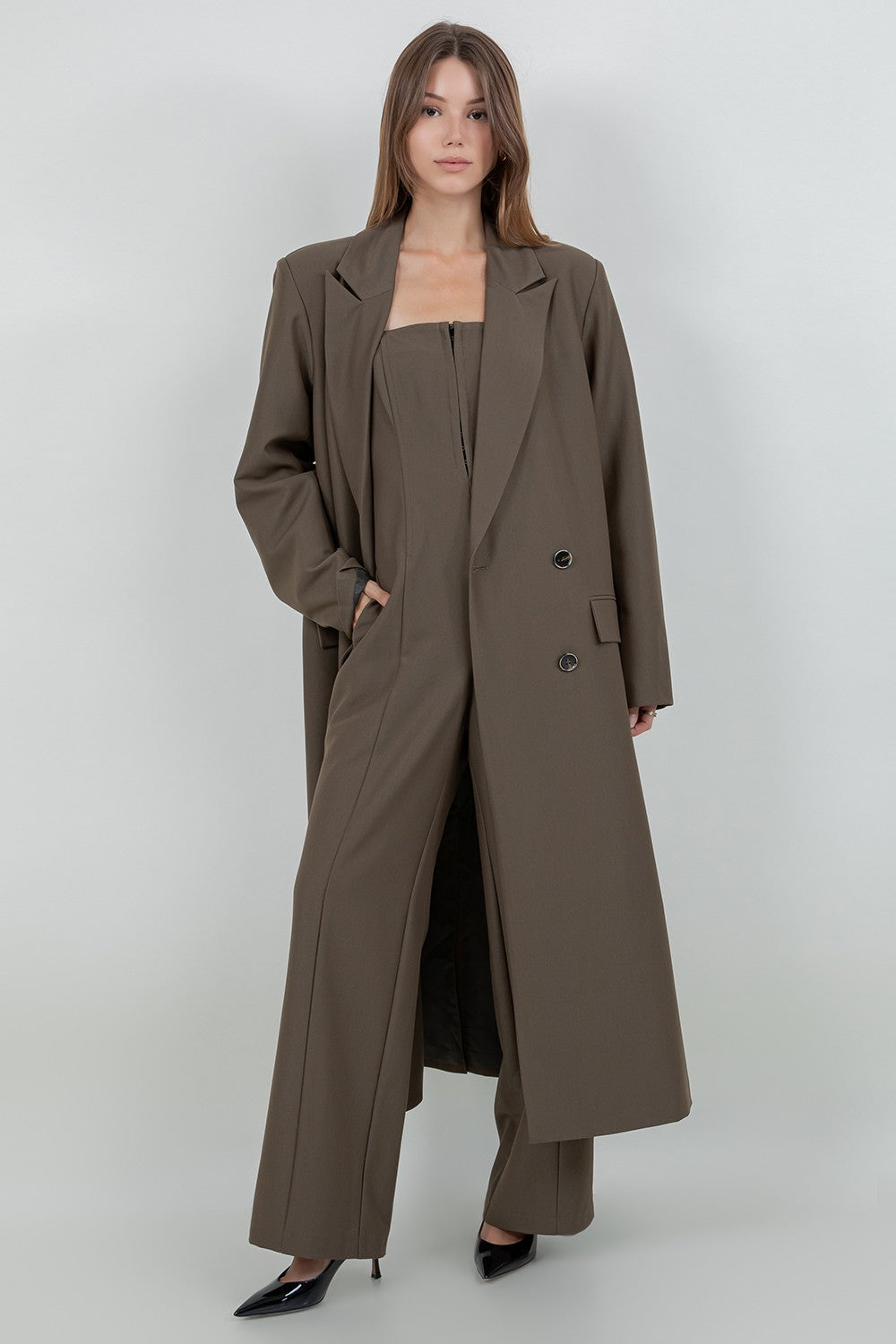 STRUCTURED WOVEN BUTTON CLOSURE LONG BLAZER JACKET  MODEL IS WEARING SIZE XS