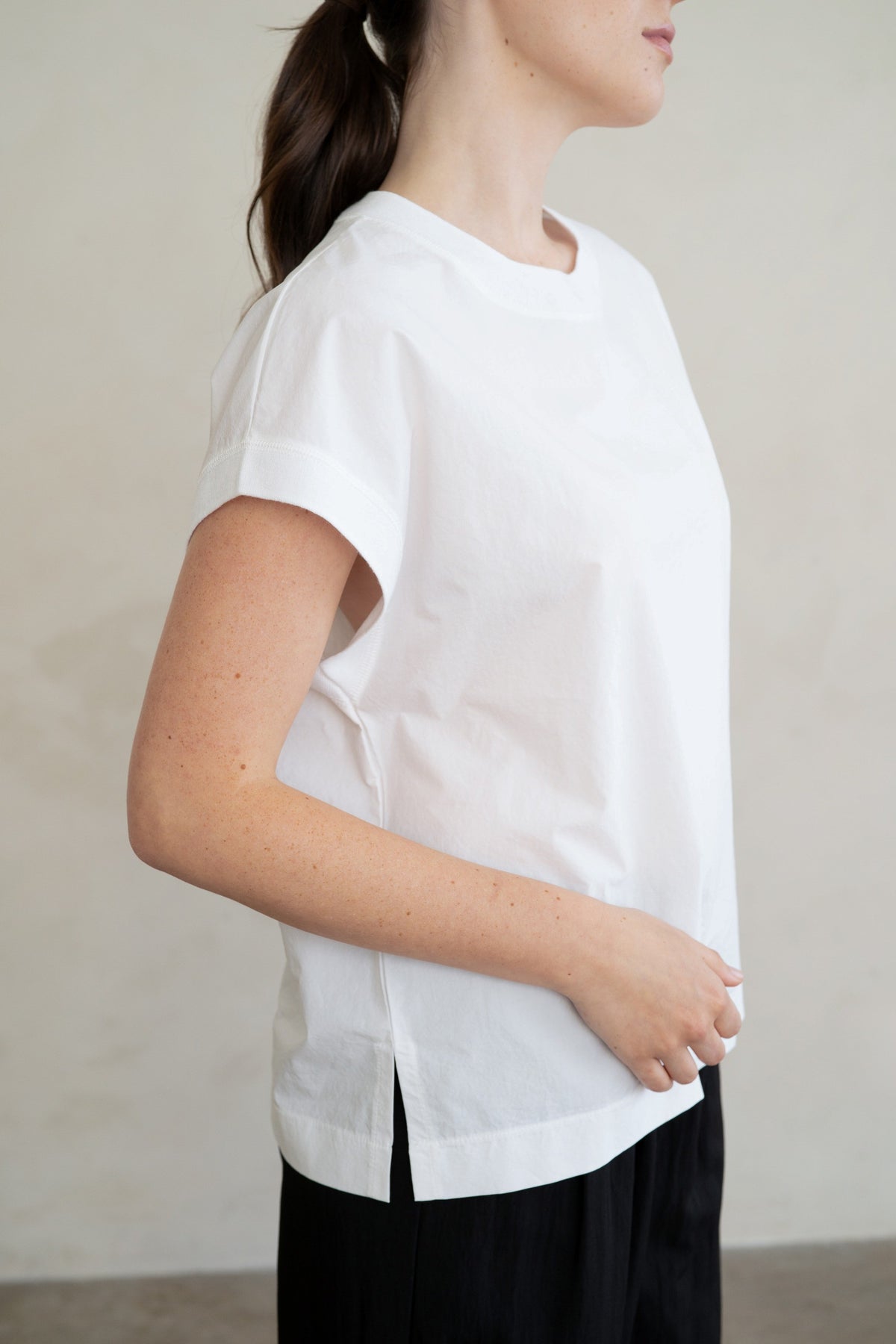 - Clean crew neckline with minimalist lines