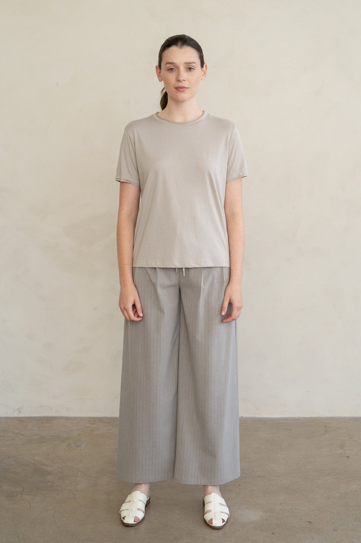 - Raw edge finish at the neckline and sleeves create an effortless, lived-in look