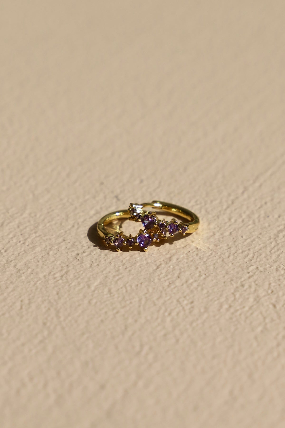 Charming petite huggie earrings showcasing an offset row of lilac cubic zirconia stones, perfect for a subtle yet vibrant touch of color.