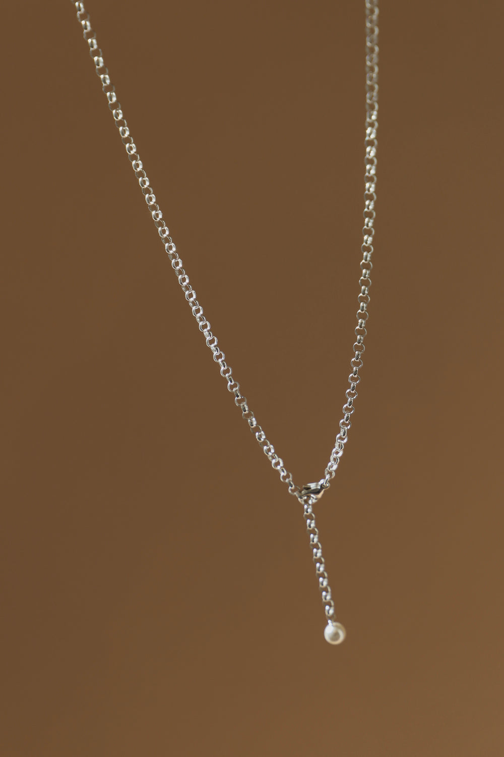 The Silver Rolo Chain Necklace is a perfect piece to add a touch of fun to any look. This unique chain adds dimension to your look and can be styled many ways. Features a Swarovski pearl drop end that adds subtle sophistication