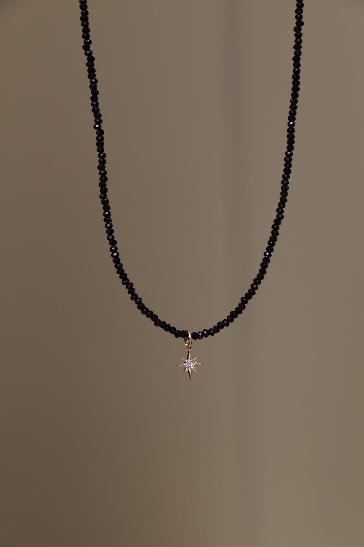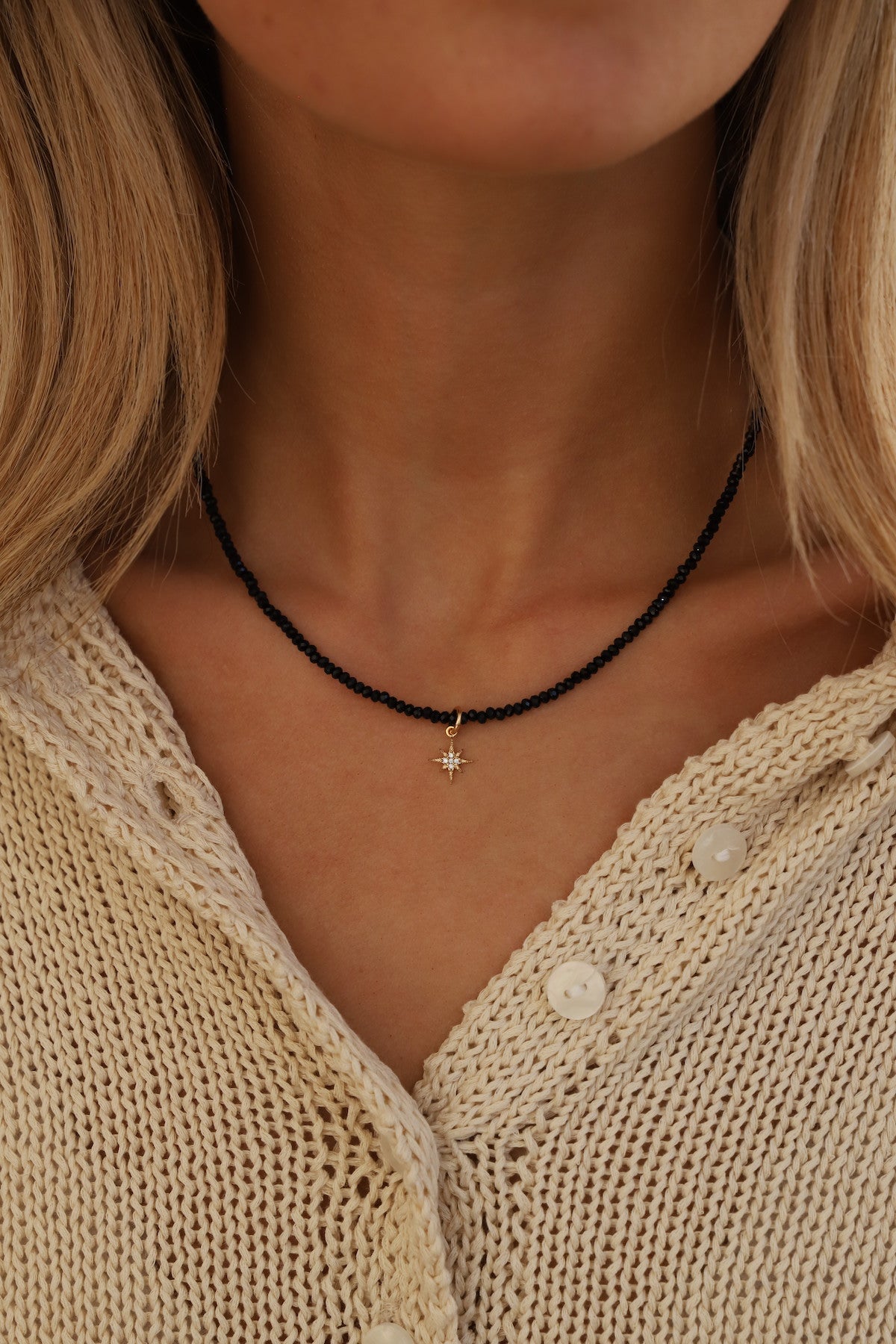 This petite black crystal beaded necklace features a charming north star pendant that catches the light beautifully. The refined design makes it versatile enough for everyday wear or special occasions, offering a subtle touch of elegance to any outfit.