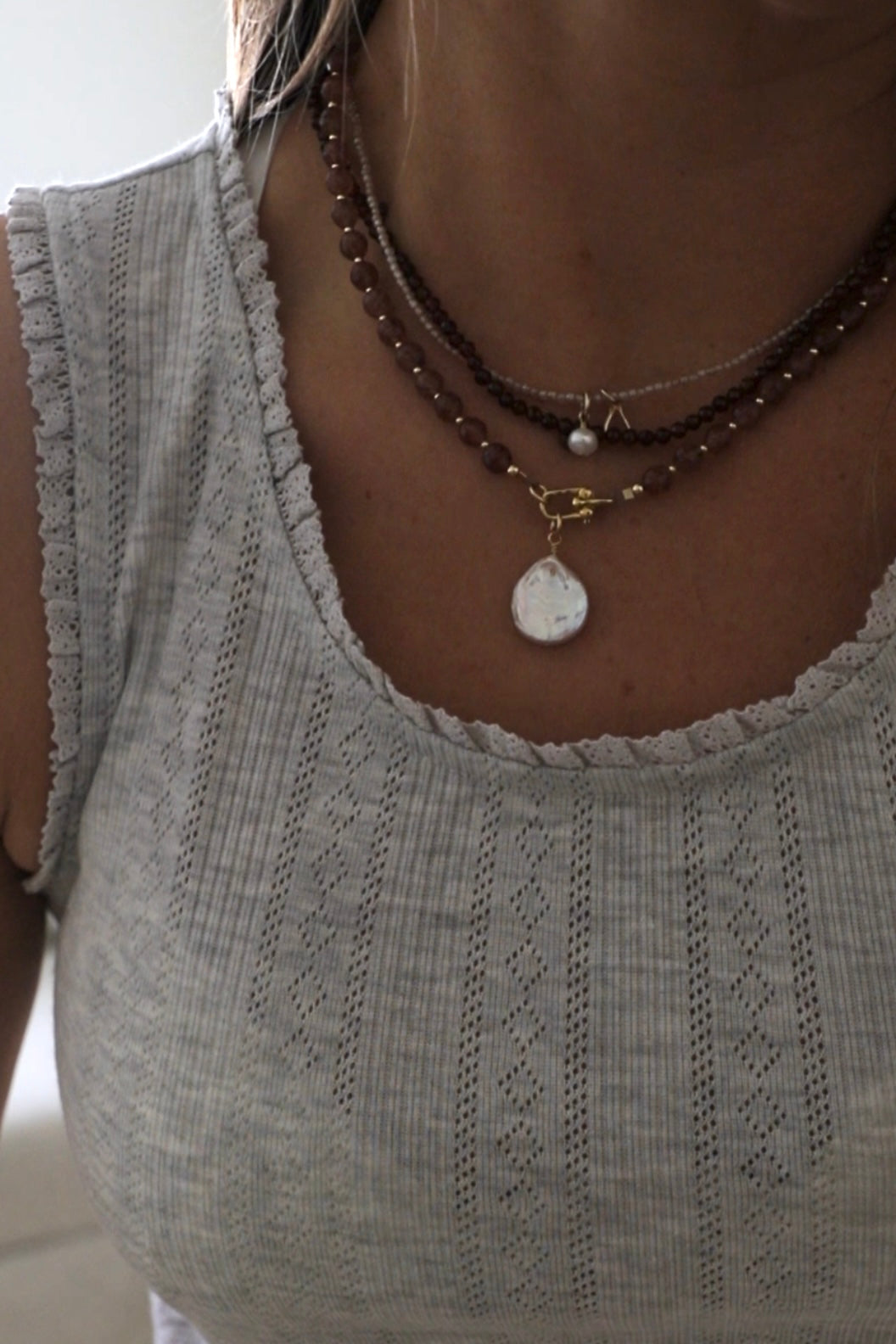 The Strawberry Quartz Beaded Necklace features moody strawberry quartz beads layered with petite gold filled beads. This necklace is completed with our mini Nova clasp, perfect for personalizing your piece with charms!