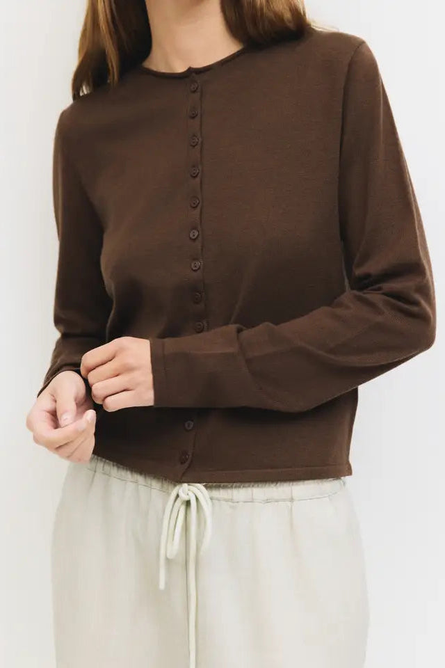 The Shea Cardigan features a cozy rolled neckline and long sleeves for a refined, comfortable look. The front button closure and midweight knit fabric make it a versatile piece, perfect for layering or wearing on its own.