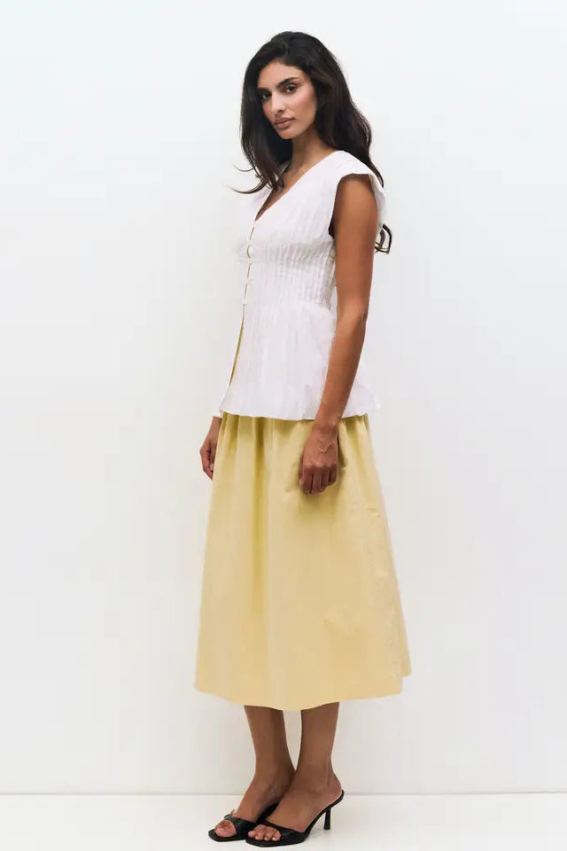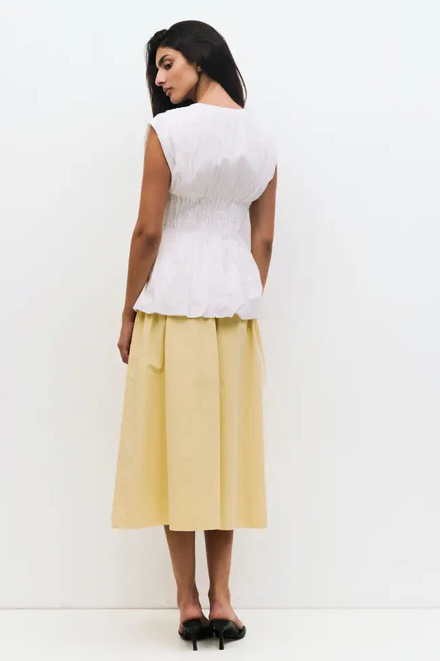 The Aleska Top is crafted from midweight cotton poplin with a sleeveless, V-neck design, featuring pleated shoulders, a pleated form-fitting waist, front partial button closure, and a bubble hem for a stylish, structured finish.