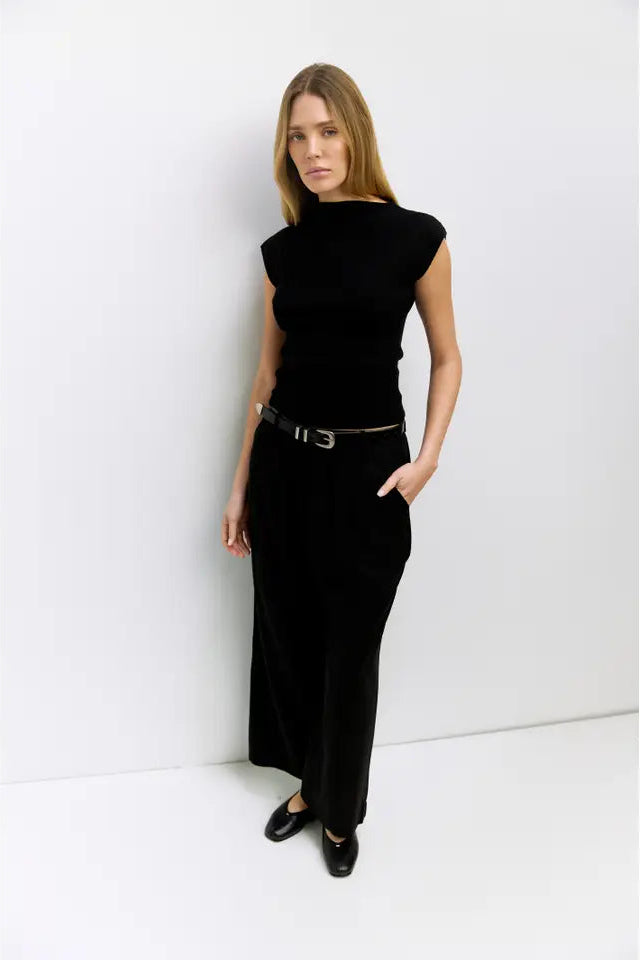 The Lori Top is crafted from a midweight blend of polyester, acrylic, modal, and nylon, featuring a wide neckline, cap sleeves, and a form-fitting silhouette.