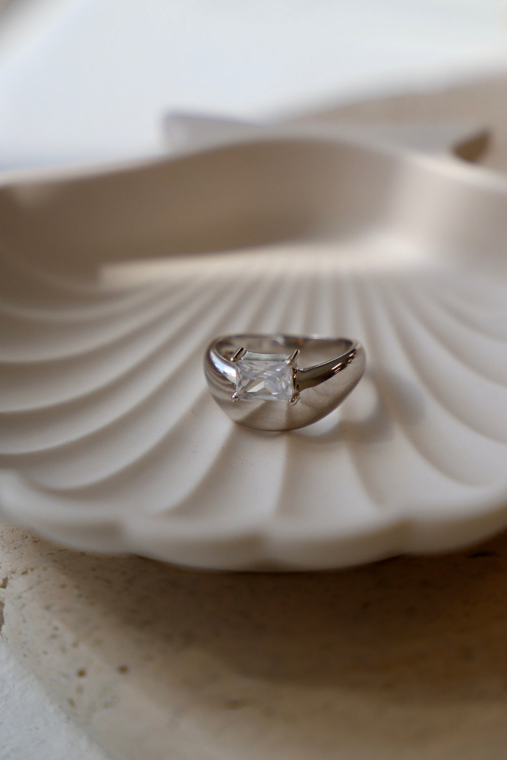 Introducing the SHAY BAGUETTE CZ RING - a bold statement of organic beauty. The thick, bubble-shaped band and brilliant clear baguette CZ center stone exude elegance and luxury. Elevate your style with this unique and sophisticated ring.