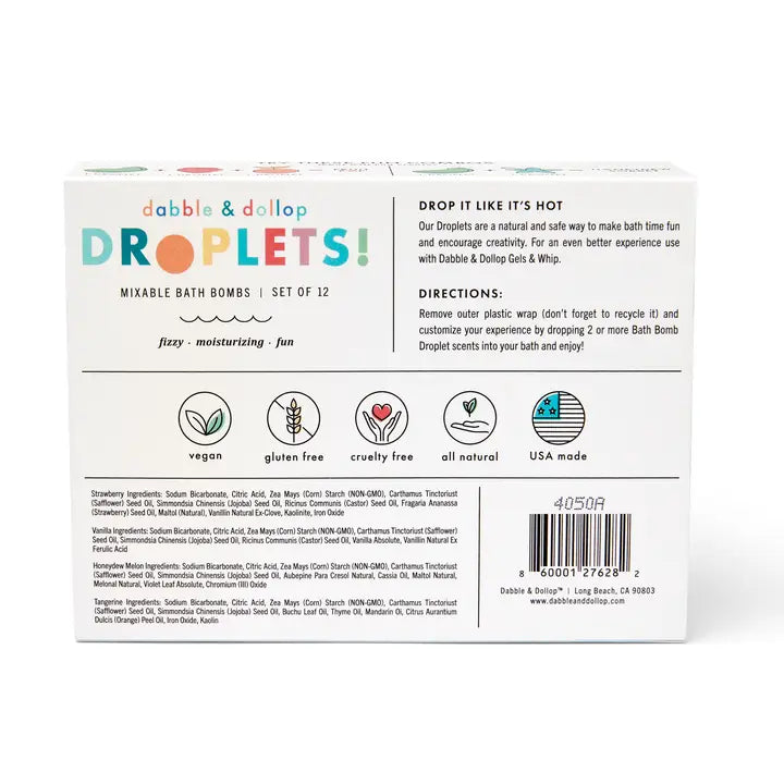 Set of 12 Dabble & Dollop Droplets take bath bombs for kids to the next level. Set includes 12 bath bombs in four fresh smelling, all-natural scents (3 Strawberry, 3 Tangerine, 3 Honeydew and 3 Vanilla). Each Droplet is “kid-sized” at 1 inch, making them perfect for a gentle, moisturizing, sweetly scented bath experience. In addition to being 100% natural, the Droplets are vegan, gluten-free, cruelty-free, and made in California, USA.